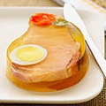 500 г отварного мяса 750 г разведенного желе 50 г вареной моркови 200 г соуса 2 вареных яйца зелень петрушки Вареное мясо нарезать поперек волокон тонкими ломтиками. В углубленный лоток налить тонкий слой желе и дать ему застыть. Затем на него уложить ломтики мяса, сверху полить желе, украсить звездочками из отварной моркови, листочками зелени петрушки и кружочками вареных яиц. Вновь залить желе, после каждого застывания, в несколько приемов, чтобы над каждым кусочком был слой желе не менее 0,5 см. Готовое блюдо подавать с соусом из хрена с уксусом.
