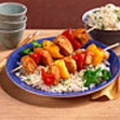 800 г филе индейки 200 г длиннозерного риса 2 сладких перца (цветных) 1 банка (300 мл) консервированного ананаса 250 г козьего сыра зеленый лук петрушка масло растительное соль специи по вкусу Ананас (кусочками) вынуть из банки, сироп перелить в отдельную миску. Сладкий перец вымыть, очистить и нарезать кусочками. Сыр нарезать небольшими кубиками. Петрушку вымыть, обсушить, измельчить. Зеленый лук промыть, обсушить и разделить пополам: одну часть нарезать крупно, другую — мелко. Филе индейки вымыть, нарезать кубиками, приправить солью и перцем. На деревянные шпажки нанизать кусочки ананаса, сладкого перца, индейки, крупно нарезанного зеленого лука, сыра. Полученные шашлычки обжарить на сковороде с разогретым маслом, постоянно переворачивая, в течение 7-10 минут. Рис отварить и смешать с измельченной петрушкой и луком. Готовый шашлык подавать с отварным рисом и соусом.