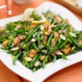 2 картофелины 2 моркови 250 г зеленого горошка 200 г зеленой фасоли в стручках 2 свеклы 100 г вареного языка 100 г маринованных огурцов майонез Для заправки: 100 мл воды, 2 ст.л. лимонного сока, 1 кусок сахара-рафинада, 1/2 ч.л. соли, 2 ст.л. растительного масла. Ингредиенты тщательно перемешать. Картофель, свеклу, морковь и фасоль отварить по отдельности в подсоленной воде до мягкости, остудить. Нарезать мелкими кубиками и перемешать в кастрюле с горошком, мелко нарезанным отварным языком и заправкой, настоять в течение 1 часа в холодильнике. Добавить мелко нарезанные огурцы, заправить майонезом по вкусу, перемешать.