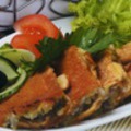 500 г мясного фарша 2 луковицы 3 яйца вода 2 вафельных коржа (готовых) соль, перец масло растительное Лук, очистить, мелко нарезать. Фарш смешать луком, посолить и поперчить, добавить немного воды (2-3 ст.л.), затем обжарить до полуготовности. На вафельный корж равномерно разложить подготовленный фарш, накрыть вторым коржом. Немножко примять, дать 10 минут постоять в холодильнике, затем нарезать небольшими квадратами (сторона около 5 см). Яца разбить в миску, посолить и слегка взбить. Каждый квадратик обмакнуть во взбитые яйца и обжарить на растительном масле до готовности.