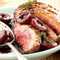 1 кг мякоти телятины 400 г вишни 150 г масла сливочного корица 1 ст.л. муки 120 мл вишневого сока соль В крупном куске мякоти телятины вдоль волокон сделать глубокие проколы ножом, нашпиговать вишнями без косточек в местах проколов, посолить. В разогретую глубокую сковороду положить телятину, полить маслом, посыпать корицей и запечь в духовке до полуготовности при температуре 200С. Муку спассеровать на маследо золотистого цвета. Затем к мясу добавить мучную пассеровку, вишневый сок, воду (мясо должно быть покрыто на половину) и тушить до готовности. Мясо нарезать на порции и подавать со свежими овощами, поливая полученным соусом.