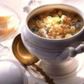 1 кг мякоти говядины 2-3 моркови 2 луковицы 50 г топленого масла 100 г шпика 50 г молотых ржаных сухарей 15 шт. картофеля 250 г сметаны бульон специи (лавровый лист, перец) соль зелень Мякоть говядины нарезать на порционные куски поперек волокон и слегка отбить. Мясо обжарить на сильном огне и уложить в порционный горшочек, дно которого предварительно покрыть мелкими ломтиками шпика. Далее сверху положить морковь и лук, нарезанные соломкой, добавить сухари, лавровый лист и перец горошком, соль, залить водой (или бульоном). Тушить в духовке в течение 1 часа при температуре 200-210С. Затем добавить нарезанный брусочками картофель, а через 20 минут - сметану. Со сметаной тушить еще 15-20 минут. Подавать в горшочке, посыпав зеленью.