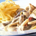 1 кг говядины 200 г копченой свиной грудинки 2-3 луковицы 100 г сливочного масла вода (бульон) 1 ст.л. муки 200 г консервированных грибов (шампиньонов, белых) 50 г вина красного сухого специи соль Мясо нарезать на порционные кусочки. Очищенный лук и копченую свиную грудинку нарезать кубиками, затем обжарить вместе с мясом в сотейнике, смазанным маслом. Затем все залить бульоном, влить красное вино, добавить специи по вкусу, посолить и тушить до готовности мяса при слабом кипении, периодически помешивая. Консервированные грибы нарезать тонкой соломкой, отдельно поджарить. Муку спассеровать на масле до золотистого цвета, соединить с поджаренными грибами, добавив бульон, в котором тушилось мясо. В сотейник с готовым мясом добавить приготовленным грибной соус и довести до кипения. На гарнир подавать отварной рис, картофель или лапшу.