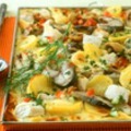 700 г картофеля 2 яйца 250 г филе свежей сельди 1 луковица 50 г растительного масла 125 мл молока 1 ст.л. муки Картофель очистить, нарезать ломтиками. Сотейник смазать маслом и положить ломтики картофеля. Сверху положить слой разделанной на кусочки сельди. Лук очистить, мелко нарезать и посыпать им сельдь. Сверху посыпать мукой и полить растительным маслом. Поставить на слабый огонь и тушить под крышкой в течение 30 минут. Молоко и яйца взбить, вылить на готовую рыбу. Поставить в духовку, накрыть крышкой и запекать еще 15 минут.
