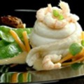 8 кусочков филе камбалы (без кожицы) 1 яичный белок 8 вареных очищенных креветок 200 мл рыбного бульона палочки (зубочистки, шпажки) Для соуса: 150 мл сухого белого вина, 150 мл рыбного бульона, 1 луковица, 1-2 зуб. чеснока, 200 мл сливок, соль, перец, паприка, 2 ст.л. измельченной зелени свежего укропа, 100 г сливочного масла. Яичный белок слегка взбить. Обмакнуть каждую креветку в белок и закатать в развернутое филе, заколоть палочками. Подготовленные рулетики уложить в углубленную форму, залить бульоном, накрыть и поставить в холодильник. Через 30-40 минут рыбные рулетики запечь в течение 20-25 минут до готовности (если бульон выпарится, добавить еще). Готовые рулетики подавать с соусом. Сделать соус: вскипятить вино с бульоном, измельченными луком и чесноком. Варить 15-20 мин., затем жидкость процедить. Смешать со сливками и готовить еще 4-5 мин. Готовый соус смешать с укропом, довести до кипения, затем, выключив огонь, положить туда кубики масла.