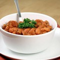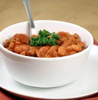 500 г фасоли 4 луковицы 250 г копченой грудинки 2-3 ст.л. томатной пасты 1-2 зуб. чеснока 1 ч.л. сахара соль, перец лавровый лист зелень Фасоль замочить на 5-6 часов в холодной воде. Затем сменить воду и налить ее столько, чтобы она покрывала фасоль сверху на 2 см. Грудинку нарезать небольшими брусочками. Лук очистить, тонко нарезать и обжарить на сковороде в растительном масле, добавив томатную пасту, в течение 7-10 минут. Фасоль перемешать, добавить грудинку и соус, посолить и поперчить по вкусу, добавить сахар и лавровый лист, варить в течение 10-15 минут. В конце добавить пропущенный через пресс чеснок. Подавать горячим с зеленью.