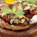 1 батон 3 помидора 2 красных луковицы 6 ст.л. оливкового масла 150 г шампиньонов 50 г оливок (фаршированных красным перцем) 1 ст.л. кедровых орешков 150 г консервированного тунца 2 ст.л. белого сухого вина 1 ст.л. лимонного сока 2 зуб. чеснока соль, перец молотый мускат зелень Чеснок очистить. пропустить через пресс, смешать с 4 ст.л. оливкового масла. Хлеб нарезать на порционные кусочки, полить чесночной заправкой. Выложить на смазанный противень и запекать в духовке в течение 5-7 минут при 180С. Фарш 1: помидоры обдать кипятком, снять шкурку, удалить семена, измельчить и смешать с кедровыми орешками. 1 луковицу очистить, мелко нарезать. Зелень (базилик, тимьян и другие) промыть, обсушить, измельчить. Смешать с помидорами и орешками. Фарш 2: шампиньоны очистить, нарезать кусочками. В сковороде на разогретом масле (2 ст.л.) обжарить грибы в течение 3-5 минут. Посолить и поперчить по вкусу, добавить мускат, вино, нарезанные оливки, перемешать. Фарш 3: оставшуюся луковицу очистить, нарезать. С консервированного тунца удалить излишки масла, смешать с нарезанным луком, посолить и поперчить по вкусу, заправить лимонным соком. На готовые тосты выложить подготовленные ингредиенты.