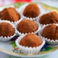 100 г сушеной вишни 700 г молочного шоколада 250 мл сливок (30%) фундук 5 ст.л. какао 1 ст.л. миндального ликера Шоколад растопить на водяной бане. В отдельной чашке довести сливки до кипения, добавить их к растопленному шоколаду. Полученную смесь взбить с помощью миксера до однородной массы. Добавить сушеную вишню, миндальный ликер, перемешать и остудить. Из чуть теплой массы слепить трюфели, добавляя в середину орех, обвалять в какао. Выложить на пергаментную бумагу, охлаждать в холодильнике в течение нескольких часов.