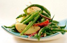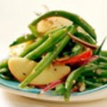 200 г отварной фасоли или 1 банка консервированной в томате (200 г) 2 больших яблока 1 средняя вареная свекла 3 ст.л. растительного масла 2 ст.л. винного уксуса зелень петрушки соль черный молотый перец Фасоль промыть, заранее замочить, чтобы она набухла, а потом отварить до готовности. Готовую фасоль откинуть на дуршлаг, чтобы стекала вода. Яблоки вымыть, обсушить, нарезать мелкими кусочками, свеклу - мелкими кубиками. Смешать готовую фасоль, яблоки, свеклу, посолить, поперчить по вкусу и заправить растительным маслом и уксусом. Перемешать и украсить петрушкой.