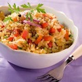 4 сладких перца (разноцветных) 8 маленьких маринованных луковиц 6 маленьких маринованных огурцов 50 г кедровых орешков 50 г изюма 1 ч.л. карри (порошок) 1/2 стак. риса растительное масло черный молотый перец соль Рис отварить в подсоленной воде, добавив порошок карри, остудить. Перец промыть, сложить в пакет для запекания, запечь в духовке до мягкости. Вынуть, снять кожицу, очистить от семян, остудить, нарезать тонкими полосками. Лук и огурцы по необходимости нарезать. Изюм замочить на 15-20 минут в теплой воде. Подготовленные ингредиенты смешать с рисом, добавить орехи, заправить маслом, поперчить и посолить по вкусу.
