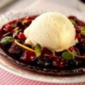 1 л молока, 300 г сахарного песка, 10 желтков (или же 4 желтка и 3-4 яйца), 30 г ванильного порошка, 100 г миндального пралине Для бисквитного теста: 3 яйца, 75 г муки, 75 г сахарного песка; Для сиропа: 100 г сахарного песка, 150 г рома Для крема: 4 яйца, 100 г сахарной пудры, 50 г джема из малины, фиолетовый пищевой краситель. Миндальное пралине окрасить пищевым красителем в густой фиолетовый цвет. Молоко прокипятить с сахарным песком. Яйца хорошо взбить и постепенно, небольшими количествами, подливать их в прокипяченное теплое молоко при непрерывном размешивании. Добавив яйца, снова поставить молоко на огонь и непрерывно размешивать, пока смесь не загустеет, но не доводить до кипения. Затем снять с огня и мешать еще 2-3 минуты, пока смесь слегка не остынет. Процедить через сито и дать остыть, поставив в прохладное место. Полученный таким способом крем заморозить (желательно в мороженице). Взять не очищенный от кожицы миндаль, окарамелизовать его и мелко истолочь. Полученный таким образом пралин из миндаля окрасить пищевым красителем в фиолетовый цвет, прибавить в замороженный крем и перемешать еще несколько раз, чтобы пралине хорошо перемешался с кремом. Отдельно из бисквитного теста выпечь "постамент", размеры и форма которого должны соответствовать размерам и форме блюда, на котором будут подавать мороженое. Готовый бисквит слегка смочить сиропом из сахарного песка, воды и небольшого количества рома или коньяка для аромата. Незадолго до подачи приготовить крем, который необходимо уложить на бисквит, а сверху шарик мороженого. При подаче можно налить вокруг мороженого ром, поджечь его и подать мороженое горящим. Крем: смешать 4 яичных желтка со 100 г сахарной пудры и растирать до образования густой белой массы. Хорошо взбить белки и затем добавить 30 г сахарной пудры, продолжая взбивать еще известное время. Готовые белки соединить с растертыми желтками. Окрасить крем в фиолетовый цвет (по желанию). Хорошо замороженную смесь выложить ложкой на бисквит. Крем следует наложить слоем толщиной в 1 см.