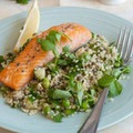 700 г филе лосося 1 ст.л. соевого соуса 1 ст.л. меда 1 ч.л. тертого свежего имбиря 500 мл овощного бульона 150 мл воды 3 стеб. лука-порея 200 мл чечевицы 2 моркови 2 ч.л. розмарина соль Для заправки: 2 ст.л. лимонного сока, 1 ст.л. меда, 2 ч.л. оливкового масла, 1 ч.л. виноградного уксуса, молотый красный перец, 1 ч.л. соевого соуса, 1 яблоко, 50 г орехов пекан. Для лосося: смешать соевый соус, мед и тертый имбирь. Полученную смесь выложить в форму для запекания, лосось обвалять в смеси с двух сторон, поставить в холодильник на 20-30 минут для маринования. Запекать в течение 15-20 минут при температуре 200С. В кастрюле нагреть бульон с водой и нарезанным луком-пореем, отварить в течение 20 минут чечевицу. Затем добавить нарезанную морковь, розмарин и соль. Варить в течение 10-15 минут до мягкости чечевицы. Затем жидкость слить, остудить чечевицу. Сделать заправку: Лимонный сок, мед, масло, соус, уксус и чуть перца взбить. Добавить натертое на крупной терке яблоко, перемешать. На тарелку выложить чечевицу и орехи пекан, полить полученной заправкой, сверху - кусочки рыбы.
