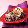 1 кг говяжьего стейка 2 ст.л. оливкового масла 100 г бекона 1 луковица 1 головка чеснока (6-8 зуб.) 1 стак. сухого красного вина гвоздика майоран тимьян петрушка лавровый лист соль черный перец Мясной стейк нарезать кубиками 4x4 см, бекон - 5х5 см. В сотейнике нагреть масло, обжарить бекон на медленном огне, пока он не начнет отдавать жир. Увеличить огонь, добавить кусочки говядины, жарить в течение 5 минут, помешивая. Говядину и бекон выложить на блюдо. На оставшемся масле обжарить измельченные чеснок и лук в течение 7-10 минут, помешивая. Затем добавить вино, положите гвоздику, травы (по 1 веточке), соль и перец. Положить мясо и бекон обратно в сотейник, накрыть крышкой, тушить на медленном огне в течение 2 часов, помешивая, пока мясо не станет мягким (проверять достаточно ли жидкости).
