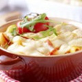 350 г макарон твердых сортов 1 л нежирного куриного бульона 300 г замороженных овощей Для соуса: 2,5 стак. молока (0,5%), 2 ст.л. пшеничной муки, 1 бульонный кубик, 5 ст.л. тертого сыра. Макароны отварить в бульоне до готовности. Половину выложить в огнеупорную посуду, сверху высыпать замороженные овощи, затем оставшиеся макароны. Смешать молоко с мукой и нагревать в кастрюле, пока соус не загустеет. Затем добавить измельченный бульонный кубик и варить еще 5-10 минут. В конце добавить тертый сыр. Залить соусом макароны и запекать в духовке при 225С в течение 25-30 минут.
