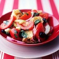 500 г белого хлеба 6 помидоров 3 шт. сельдерея петрушка 2 красные луковицы 10-12 шт. маслин без косточек 4 ст.л. оливкового масла 2 ст.л. винного уксуса соль перец черный молотый по вкусу Хлеб нарезать кубиками, замочить в холодной воде со щепоткой соли, затем отжать и положить в миску. Помидоры вымыть и нарезать дольками. Черешки сельдерея вымыть и нарезать кусочками слегка наискосок. Листья сельдерея и петрушки нарезать. Лук очистить и нарезать тонкими кольцами. Маслины нарезать кружочками. Все перемешать с хлебом, сбрызнуть оливковым маслом и поставить на 30 минen в холодильник. Перед подачей приправить винным уксусом, посолить, поперчить по вкусу, тщательно перемешать.