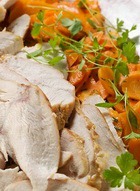 1,5-1,7 кг филе индейки 1 ст.л. имбиря 2 ст.л. соевого соуса 1 лайм 3 ст.л. абрикосового джема 100 г семян кунжута 800 г моркови 2 ст.л. сливочного масла 2 ст.л. сахарного песка 100 мл апельсинового сока соль перец черный молотый зелень Сделать маринад: имбирь смешать с соевым соусом, соком и цедрой лайма, джемом и кунжутом. Индейку вымыть и обсушить, смазать получившимся маринадом и поставить на ночь в холодильник. На следующий день духовку нагреть до 180-200С. Мясо запекать 60-75 минут, время от времени поливая маринадом. Морковь очистить, вымыть, нарезать кружками и жарить 5 минут на сливочном масле, посыпав сахаром. Добавить апельсиновый сок, посолить, поперчить и тушить морковь еще 10-15 минут. При подаче посыпать зеленью.