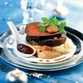 1 цыпленок (1-1,2 кг) 200 г сливочного масла соль перец черный 150 мл вина "Мадера" 150 г гусиной печенки 150 г сухариков 250 г грибов 1,3 кг каштанов 200 г молока сахар Вырезать филе и ножки цыпленка, посолить и поперчить по вкусу, обжарить на масла, не подрумянивая. Добавить вино, накрыть крышкой и тушить. При необходимости добавить немного куриного бульона (или воды). Грибы отварить до готовности в подсоленной воде. Из гусиной печенки сделать медальоны - обжарить на масле до готовности. При подаче куски филе и ножки цыпленка положить на медальоны из печени, сверху - отварные грибы. Полить соусом, в котором тушились цыплята. Подавать с пюре из каштанов. Сделать пюре из каштанов: отварные каштаны очистить от кожуры, залить молоком (150 мл) с 1 ст.л. сливочного масла. Добавить соль и сахар по вкусу, разварить до мягкости. Затем горячими протереть через сито (или пюрировать с помощью блендера), развести с 50 мл молока и 50 г сливочного масла, довести до кипения.