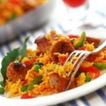 1 кг свиного фарша 200 г отварного риса 1 луковица 3 яйца кетчуп соль перец Для заправки: 4 моркови, 2 сладких перца, 1 луковица, 3 ст.л. отварного риса. Фарш смешать с рисом, добавить измельченную луковицу, вбить яйцо, немного кетчупа, соль и перец, тщательно перемешать. Затем сформовать круглые фрикадельки, обжарить их на сковороде до образования корочки. Сделать заправку: перец нарезать мелкими кубиками, потушить в сковороде, затем добавить нарезанные лук и морковь, перемешать, тушить 5-10 минут. Затем добавить рис, кетчуп, воду, соль и перец по вкусу, потушить еще 10 минут. В кастрюлю слоями выложить тефтели и заправку, потушить на слабом огне 20 минут.