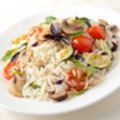 рис "Индика голд" Мистраль — 2/3 стак. грибы – 100-150 г помидоры черри – 100-150 г чеснок – 3 зуб. цукини – 1 (небольшой) растительное масло — несколько столовых ложек соль, специи, зелень для украшения — по вкусу Отварить рис до готовности. Для этого в кастрюлю с кипящей водой засыпать рис, довести до кипения и плотно закрыть крышкой. Варить на медленном огне 30 минут, не закрывая крышкой. Затем откинуть рис дуршлаг, промыть под струей горячей воды и переложить его обратно в кастрюлю или поставить дуршлаг над ней. Оставить рис на 5 минут, прикрыв крышкой или кухонным полотенцем. Промыть и порезать грибы, обжарить их на сковороде, смазанной растительным маслом с добавлением порубленного чеснока и соли по вкусу, регулярно помешивая. Цукини нарезать полукружиями, поджарить до готовности, посолить. Помидоры нарезать полукружиями и поджарить до готовности с добавлением порубленного чеснока, соли и специй по вкусу. Овощи и грибы слегка перемешать с готовым горячим рисом, украсить зеленью по вкусу. В салат можно добавить соус по вкусу или сбрызнуть лимонным соком. Подать горячим на стол в качестве салата или гарнира. Другие гарниры >>>