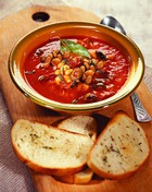 1 л протертых томатов Pomi Parmalat 3 ст.л. оливкового масла 400 г белой консервированной фасоли 1 красная луковица 2 зуб. чеснока 200 мл белого сухого вина 4 ст.л. маслин без косточек 100 г пасты Divella ригатони Parmalat Соль и перец Зелень по вкусу Лавровый лист Маслины нарезать кружками. Лук и чеснок очистить, измельчить и обжарить в разогретом в кастрюле оливковом масле, 3 мин. Влить вино, уменьшить огонь до среднего и готовить еще 3 мин. Добавить в кастрюлю томаты и прогреть, помешивая, 2 мин. Влить 1 л воды, довести до кипения. Положить в суп фасоль и маслины, перемешать и варить 10 мин. Макароны отварить в кипящей подсоленной воде до полуготовности, 4 мин. Добавить в суп. Готовить под крышкой 6 мин. Приготовить гренки Ингредиенты: 6 ломтиков белого хлеба, 2 зубчика чеснока, 100 г тертого сыра, масло, соль, базилик. Чеснок измельчить и растереть с солью. Смазать ломтики хлеба с обеих сторон маслом, натереть смесью чеснока и соли, посыпать тертым сыром и базиликом. Запекать в духовке при температуре 220°С 5-7 минут. Другие рецепты итальянской кухни >>>