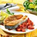 4 стейка лосося 1 лук-шалот 6 ст.л. соуса-маринада Teriyaki Kikkoman 1 ч.л. горчицы в зернах Для заправки: 1 помидор, 1 красный перец, 2-3 ст.л. сладкого соевого соуса Kikkoman, 6 ст.л. кетчупа Промыть стейки лосося в прохладной воде и хорошо просушить. Почистить шалот, порезать на маленькие кусочки и смешать с Teriyaki и семенами горчицы. Смазать лосося подготовленным соусом и поджаривать на алюминиевой решетке в течение 15 мин. Для заправки: помидор и перец мелко порезать и смешать со сладким соевым соусом, кетчупом и подать вместе с лососем. Другие рецепты с соевым соусом >>>