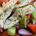 250 г сладкого перца 200 г огурцов 200 г помидоров 2 репчатые луковицы 150 г брынзы 10 г зелени укропа 10 г зелени петрушки 10 г зелени базилика растительное масло соль, перец лимонный сок по вкусу Перец, огурцы, помидоры нарезать примерно одинаковыми ломтиками, всю зелень измельчить, перемешать, посолить, поперчить, заправить смесью лимонного сока с маслом. Выложить с салатник, посыпать измельчённой брынзой.