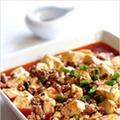 2. Разогрейте вок, добавьте 2 ч.л. масла, обжарьте свиной фарш. Добавьте зеленый лук, чеснок и соус чили. Непрерывно помешивайте в течение 20 секунд. Приправьте соевым соусом, солью, сахаром, добавьте кубики тофу. Аккуратно перемешайте, но не повредите при этом сыр.