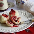 Отварить картофель в подсоленной воде (в пароварке) ок. 20-30 мин., сцедить и размять. Дать ему остыть. Добавить к картофелю яйцо, щепотку соли и мускатного ореха, маргарин, картофельный крахмал, смешать ингредиенты до однородности и оставить на 15-20 мин., чтобы "связались" картофельные молекулы... Столовую ложку картофельного теста выложить толстенькой лепёшечкой на ладонь, присыпанную мукой, и выложить в центре ок. 1 ч. л. брусничного соуса. Сформировать колобок, "защепив" края лепёшки. В широкой кастрюле вскипятить воду, добавить соль (0,5 ч. л.), уменьшить огонь до минимума и аккуратно вложить в еле кипящую воду подготовленные кнодели. После всплытия кноделей, дать им около 20 мин. "напитаться" влагой, в слегка кипящей воде, под полуприкрытой крышкой... Выловить кнодели шумовкой. Очень похожи на ленивые пончики, не правда ли? Кстати, ни капли соуса не вытекло!