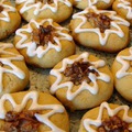 Печенье укладывать на лист достаточно далеко друг от друга (увеличивается при выпечке). Выпекать в предварительно нагретой до 200*С духовке 15 минут (слегка подрумянить). Пока печенье остывает, взбить белок, постепенно добавляя сахарную пудру, до однородной гладкой массы. Из кулинарного шприца нанести глазурь "лучиками" на печенье. Глазурь быстро застывает.