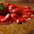 Для сливочного крема взбиваем сливки и крем-фреш (или густую сметану) с 20 гр сахара. Готовый корж разрезаем на 2 части. Дело непростое, т.к. он не толстый, зато после пропитки кремом он увеличивается в 2 раза! Нижнюю половину укладываем снова в форму с разъемными краями, выливаем почти весь сливочный крем на корж (оставляем немного крема для обмазки краев торта), закрываем второй половиной, сверху выливаем 2/3 ягодной заливки, на нее выкладываем крупно нарезанные оставшиеся 500 гр клубники и заливаем остатками ягодной заливки. При желании верх украшаем и отправляем торт в холодильник, желательно на ночь. Утром вынимаем торт из формы, обмазываем края оставшимся сливочным кремом и обсыпаем листиками миндаля. Готово!