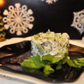 Для сервировки можно использовать порционную подачу. В этом случае прошу не переусердствовать с заправкой, иначе салат быстро "потечёт". Берём кулинарное кольцо, ставим на тарелку, кладём салат, утрамбовываем. Снимаем кольцо, я обычно утрамбовываю с помощью "толкушки" для картофеля и ею же надавливаю, когда снимаю кольцо. Украшаем салат зеленью.