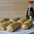 Тесто делим на 6 частей (приблизительно по 60 гр). Раскатываем каждый кусочек в прямоугольник толщиной около 2 мм. На край теста кладём около 2 ст. ложек начинки. Закрываем начинку с краю и по бокам тестом. Сворачиваем в трубочку. На противень кладём пекарскую бумагу, на неё швом вниз пирожки. Смачиваем сверху кисточкой водой и посыпаем кунжутом. Ставим в нагретую до 200 градусов духовку и выпекаем до румяности 25 минут. Пирожки вкусны как горячие так и холодные.
