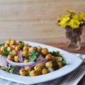 Лук нарезаем полукольцами и заливаем соком лимона, отставляем мариноваться. Картофель отвариваем с кожурою (в "мундире"). Горячий картофель чистим, нарезаем кубиками, посыпаем свежемолотой смесью перцев, солим, поливаем соком лимона и растительным маслом. Добавляем к картофелю нарезанные кубиками маринованные корнишоны и мелко нарезанную зелень кинзы. Добавляем маринованный лук, перемешиваем. На сковороду наливаем растительное масло, нагреваем, кладём отваренный нут, посыпаем семенами кумина, обжариваем до румяности. На сервировочную тарелку выкладываем картофель с корнишонами и луком. Сверху выкладываем горячий поджаренный нут, украшаем зеленью кинзы. Подаём сразу.