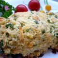 Филе горбуши посолить, поперчить, полить лимонным соком и оставить мариноваться минут на 30. Этим временем делаем хлебное "тесто": смешиваем хлебный мякиш, тертый сыр, измельченный чеснок, мягкое масло, соль и измельченную зелень. Горбушу выкладываем в форму для запекания и накрываем ее хлебным "тестом". Ставим в разогретую до 160 градусов духовку до зарумянивания хлебной корочки. Вот такая горбуша получается в разрезе!