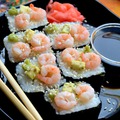 Обрезаем края, режем ролл ровно посередине, потом еще раз пополам, и еще раз. Нож нужен очень острый, его надо очищать салфеткой при нарезании - налипает рис. Ну вот где-то так получилось. Украшаем роллы креветками, кусочками авокадо, присыпаем кунжутом. Подаем с имбирем и соевым соусом.