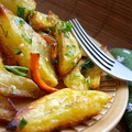 Картофель почистить и нарезать не очень мелкими дольками. Разложить картофель на противне, смазанном 1 ст.л. оливкового масла, выложить на картофель хлопья сливочного масла, поперчить, посыпать розмарином и крупной солью по вкусу. Запекать в разогретой до 225 градусов духовке 20 минут. Морковь почистить и нарезать крупной соломкой. Добавить морковь к картофелю вместе с лавровым листом. Запекать еще 25 минут, периодически помешивая. Смешать измельченную петрушку, чеснок и растительное масло. За 10 минут до готовности посыпать картофель кунжутом. Полить соусом из петрушки и чеснока готовый картофель и сразу же подать к столу.