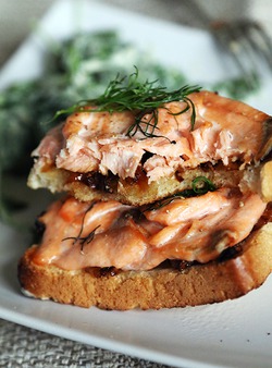 Берем филе лосося и нарезаем тонкими ломтиками. Их количество будет зависеть от размеров филе, размеров хлеба и Вашего мастерства)) У меня ушло примерно по 2 ломтика на бутерброд.