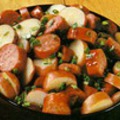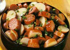 200 г колбасы или ветчины 3-4 шт. вареного картофеля 50 г сельдерея 75 г корнишонов (или маринованных огурцов) 1 яблоко 75 г салата ½ стакана майонеза Нарезать зеленый салат. Колбасу, картофель, сельдерей, яблоки и корнишоны нарезать ломтиками, сложить в салатницу. Майонез смешать с небольшим количеством горчицы, мелко порезанной зеленью петрушки и эстрагоном, прибавить уксус и посолить по вкусу. Заправить подготовленные продукты соусом, уложить в салатник и при желании украсить ломтиками вареной свеклы, яблока и кольцами лука. Колбасу можно заменить ветчиной.