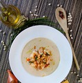 В сковороде разогреваем сливочное масло вместе с небольшим количеством оливкового, добавляем креветки и отложенную фасоль, обжариваем до золотистой корочки (но недолго!!), солим и перемешиваем с нарезанным зеленым луком. Сервируем! В подогретые тарелки раскладываем обжаренные с фасолью креветки, заливаем супом и сбрызгиваем оливковым масло.
