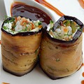 Из риса формируем шарики и выкладываем на одну сторону баклажана. Сворачиваем в рулет.