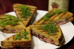 На 4 куска хлеба намазываем слой горчицы. Затем кладем по 1 куску сыра, потом слой брусничного соуса, затем кладем кусок ветчины, намазываем второй слой брусничного соуса и сверху кладем второй кусок сыра.