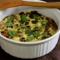 Яйца добавляем в молоко и слегка взбиваем. Обжаренную массу перекладываем в сотейник или другую керамическую форму и заливаем яичной смесью. Сверху кладем лавровые листья. Ставим в предварительно нагретую до 180С духовку на 50 минут. При подаче посыпать зеленью.