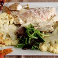 Когда рыба готова, переложить ее на тарелку и подавать со стейком из цветной капусты и легким салатом.