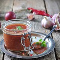 Спустя время, соус следует процедить через сито, перелить обратно в кастрюлю, вскипятить, разлить в стерилизованные банки, закрыть крышкой, перевернуть, накрыть махровым полотенцем и оставить до полного остывания.