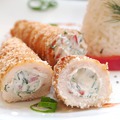 Готовые куриные трубочки вынуть из духовки, освободить их от формочек и нити. Наполнить начинкой.