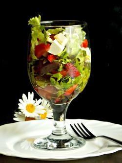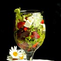 Зелень и салат порезать не мелко. Смешать с порезанными фруктами и помидорками. Добавить сыр и выложить в красивые бокалы. Поливаем соусом и подаем.