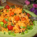 В глубоком казанке на растительном масле спассеровать лук, нарезанный кубиками, и морковь, натертую на крупной терке. Затем добавить кусочки отваренной индейки, немного шафрана, соль и специи по вкусу.