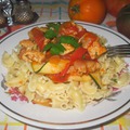Куриное мясо обжарить на оливковом или растительном масле на сильном огне в течение 3-4 минут. Добавить к мясу лук, чеснок и перец. Обжарить еще в течение двух минут. Добавить томатную пасту, все перемешать. Помидоры нарезать дольками или кубиками. К мясу добавить нарезанные помидоры и 50 мл воды. Томить около 10 минут.