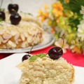 Осторожно вмешать черешню в тесто. Дно и бока формы (диаметр 20 см.) застелить смазанной растительным маслом бумагой для выпечки, выложить тесто, поставить для расстойки на 15-20 минут. Выпекать 30-35 мин. до сухой лучинки. Готовый пирог остудить в форме. Выложить на блюдо пирог, обмазать верх и бока любым джемом, посыпать верх и бока миндальными лепестками, украсить кокосовой стружкой, свежей черешней и листиками мяты.