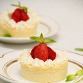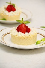 Охлажденную запеканку разрезать порционно с помощью формовочного кольца. Взбить сливки с сахарной пудрой до загустения. Украсить запеканку сливками и клубникой.